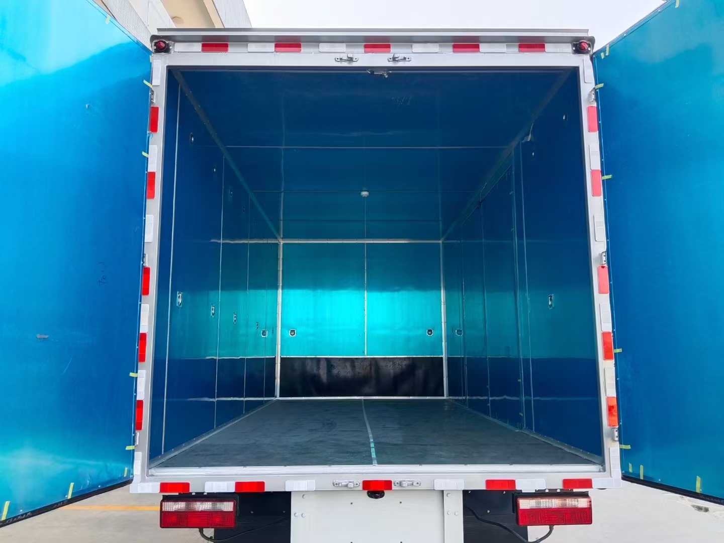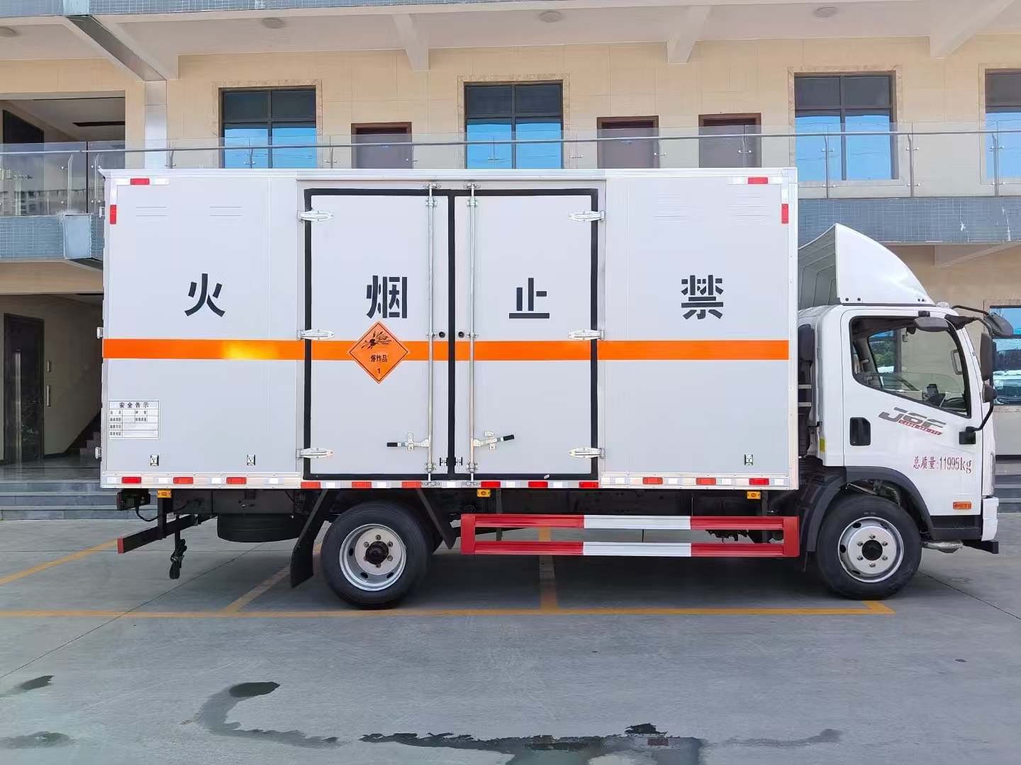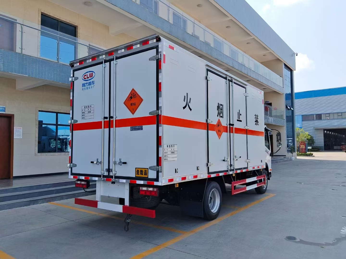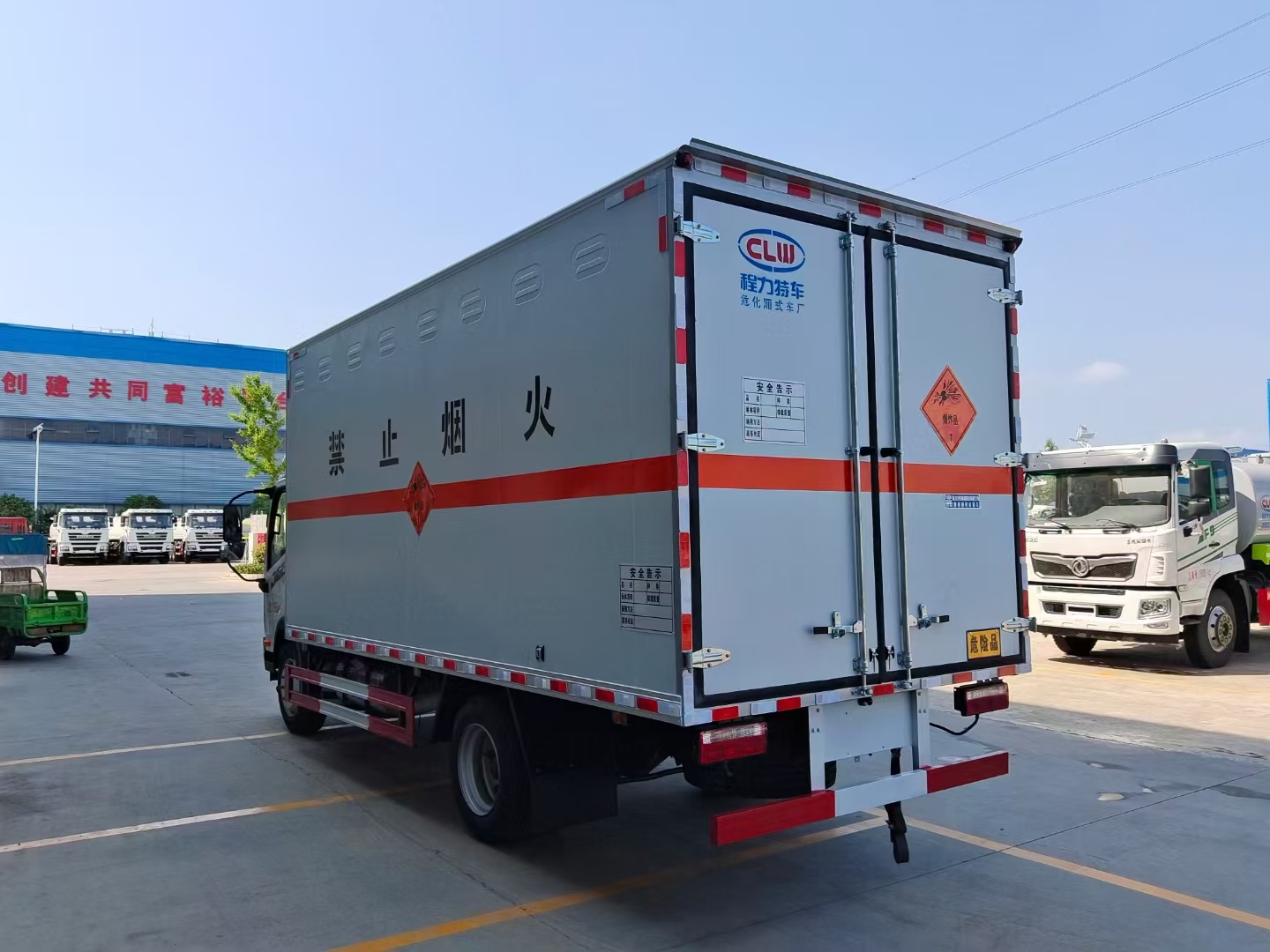 | 貨箱配置 | 廂體為雙層金屬骨架結(jié)構(gòu),外板采用冷軋鋼板,中間填充阻燃泡沫,內(nèi)飾為鋁板。底板為平板上鋪防靜電膠皮。廂內(nèi)兩側(cè)加裝固定貨物臥環(huán),門框帶防盜報(bào)警器,頂部帶煙霧報(bào)警器,廂體右側(cè)選裝側(cè)門,隨車配2個滅火器,危險(xiǎn)標(biāo)志牌,防火帽,危險(xiǎn)品三角頂燈。 (尾部可選裝液壓升降尾板) | ||