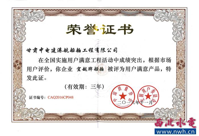 全國用戶滿意工程是由中國質量協會發起并聯合國家有關部門、行業協會于1996年開始共同推進的一項社會性質量活動。2016年,為貫徹落實《質量發展綱要(2011—2020年)》《中國制造2025》文件精神、引導廣大企業進一步樹立“以用戶為中心”的經營理念,中國質量協會和全國用戶委員會繼續開展了“實施用戶滿意工程”推進活動。本次評選活動自2016年8月開始,逐層上報,經永靖縣臨夏州、甘肅省質監局、中國質量協會分別調研,以及第三方用戶滿意度測評、推薦單位推薦和專家評審,于 2016年10月,中國質量協會下達文件,西北院港航船舶公司成功通過初審。11月24日,港航船舶公司“宜越牌船舶”被評為用戶滿意產品,在2016年全國實施用戶滿意工程推進大會受到表彰。