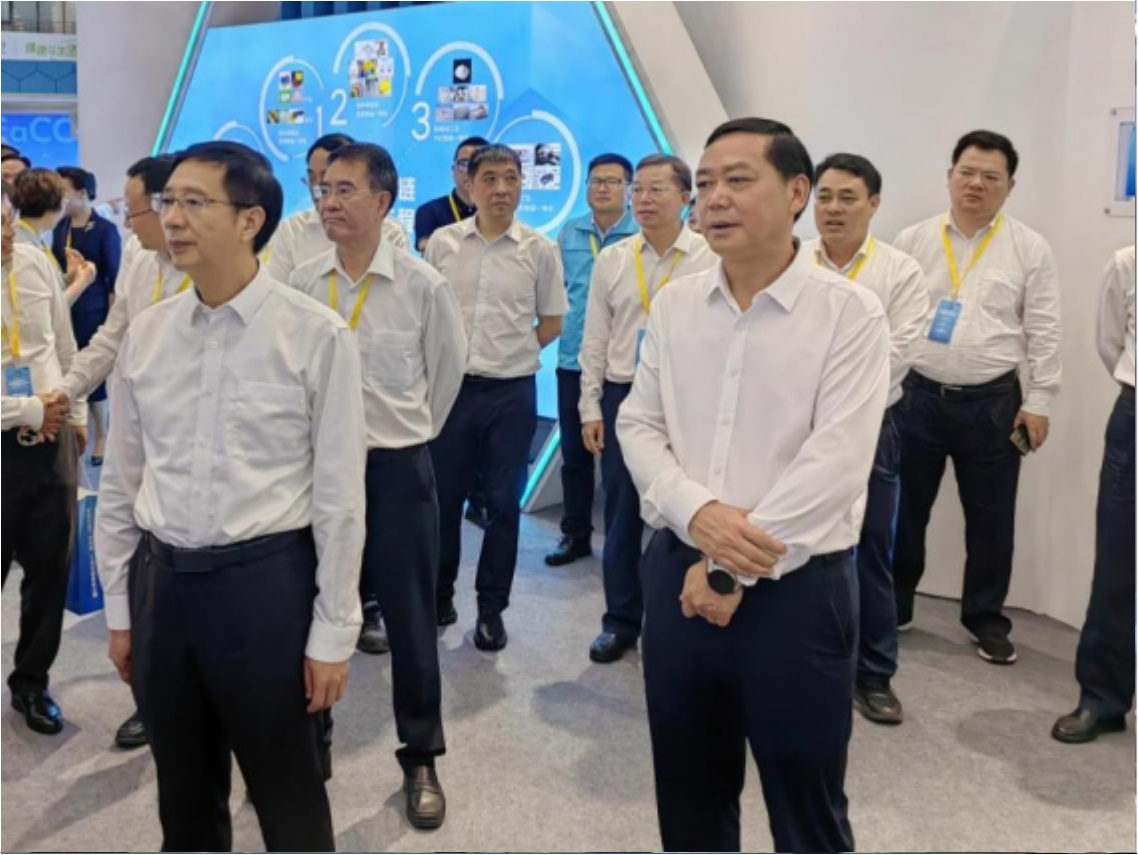 開幕式后,李禮平會長與賀州市領導一同前往廣西東融石材碳酸鈣交易中心一樓進行現場巡館,參觀了賀州市石材碳酸鈣產業的最新成果和產品展示。展館內,各類石材制品種類豐富,充分展示了賀州市在石材碳酸鈣領域的技術實力和創新力。