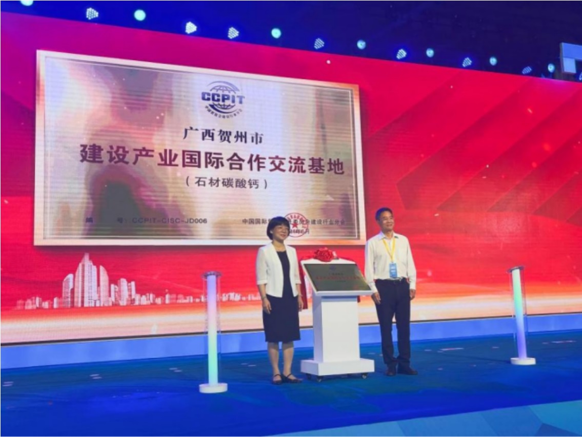 開幕式上還舉行了“建設產業國際合作交流基地(石材碳酸鈣)”授牌儀式。在音樂聲中,李禮平會長與賀州市人民政府副市長羅劍共同上臺,為“建設產業國際合作交流基地(石材碳酸鈣)”的授牌儀式按下啟動按鈕,標志著賀州石材碳酸鈣產業在國際化道路上邁出了堅實的一步。