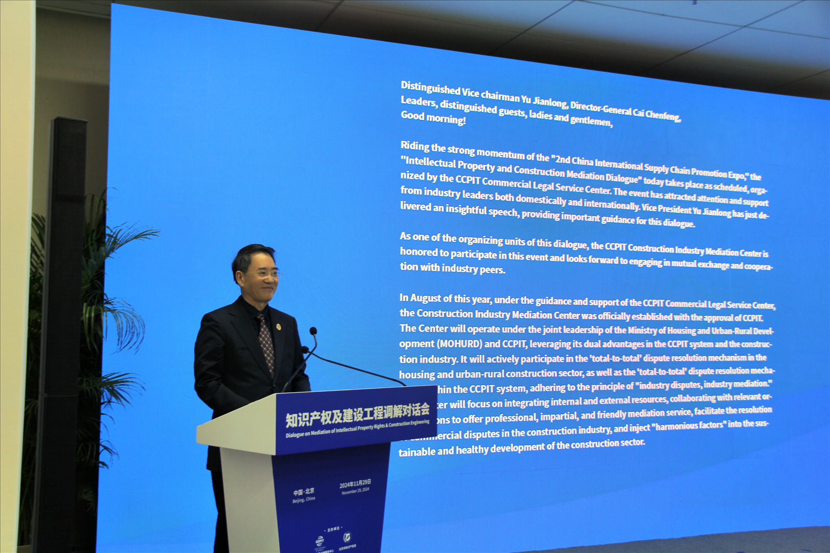 中國貿促會商事法律服務中心主任蔡晨風主持會議,中國貿促會副會長于健龍、馬來西亞律師公會主席穆罕穆德·埃茲里·阿卜杜勒·瓦哈卜(Mohamad Ezri Abdul Wahab)、北京市知識產權局黨組成員、副局長周立權、中國貿促會建設行業分會會長李禮平分別致辭。