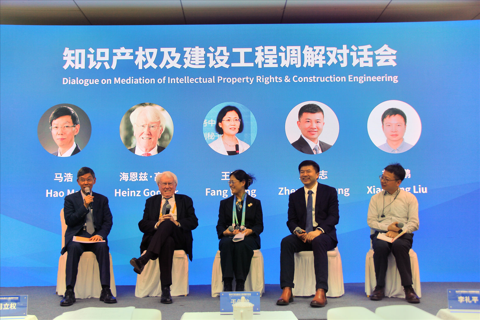 在知識產權對話環節,來自中國貿促會調解中心副主席馬浩、德國博默特&博默特律所合伙人、中國貿促會調解中心知識產權專業委員會委員恩茲·高達Heinz Goddar、中國貿促會調解中心副秘書長王芳、高文律師事務所主任王正志、華為知識產權部法務總監劉曉鵬五位專家圍繞調解化解知識產權糾紛開展對話交流。