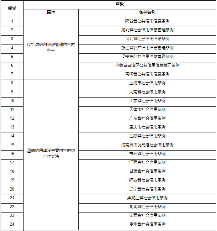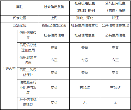 當(dāng)前,我國地方信用立法實踐主要存在“小法”和“折中”兩種立法模式。“小法”立法模式是指對微觀領(lǐng)域如經(jīng)濟(jì)、金融領(lǐng)域的信用行為進(jìn)行法律規(guī)制,強(qiáng)調(diào)信用的可量化性,認(rèn)為僅需規(guī)制私權(quán)利主體履約方面的經(jīng)濟(jì)信用。目前《征信業(yè)管理條例》和地方的“信用信息管理條例”均為該模式。“折中”立法模式是指對私權(quán)利主體和公權(quán)力主體的履約和守法等信用行為進(jìn)行規(guī)制,強(qiáng)調(diào)要調(diào)整私權(quán)利主體的信用問題,對公權(quán)力主體的誠信問題僅做基于價值觀層面的原則性規(guī)定。目前,各地“社會信用條例”均為該立法模式。總體來看,各地信用立法可分為采用“小法”立法模式的湖北、河北“社會信用信息(管理)條例”和陜西、浙江“公共信用信息(管理)條例”,采用“折中”立法模式的上海、河南、天津、山東“社會信用條例”。隨著社會信用體系建設(shè)高質(zhì)量發(fā)展逐步深化,信用立法更加強(qiáng)調(diào)基礎(chǔ)性、綜合性立法,已有17省10市出臺社會信用條例,確保社會信用信息處理和使用、信用激勵與約束的規(guī)則、信用主體權(quán)益保護(hù)措施、信用服務(wù)行業(yè)促進(jìn)與發(fā)展、社會信用環(huán)境建設(shè)等信用工作有法可依。