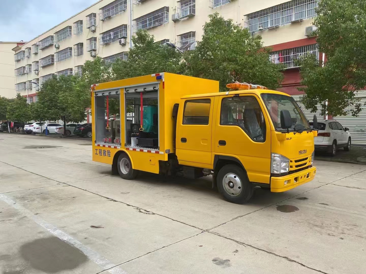 上裝配置  車箱一體式全封閉車箱車箱有隔音功能,廂體防火,阻燃,防雨,防塵,防銹,降噪,隔震,長期抗震結(jié)構(gòu),廂體外觀按照公告外觀制作,左右卷簾門,尾部是卷簾門,廂內(nèi)安裝LED作業(yè)燈,作業(yè)燈帶獨(dú)立開關(guān),底板采用花紋板。配備康明斯50KW發(fā)電機(jī)組,2臺(tái)功率22KW便攜式超輕型高速潛水泵,單臺(tái)水泵流量可達(dá)500m³/h,單泵配40米排水管(20米/根),水管直徑 DN200mm,水管材質(zhì)為滌綸長絲編織。配有升降照明燈,升降燈可通過無線和有線遙控兩種方式控制,升降燈升降高度為1.2米,可水平旋轉(zhuǎn)。帶接地樁和接地電纜線,便攜泵控制柜,潛水泵浮圈,長排警燈,倒車影像,配兩只手提式干粉滅火器2只。其余為標(biāo)配…